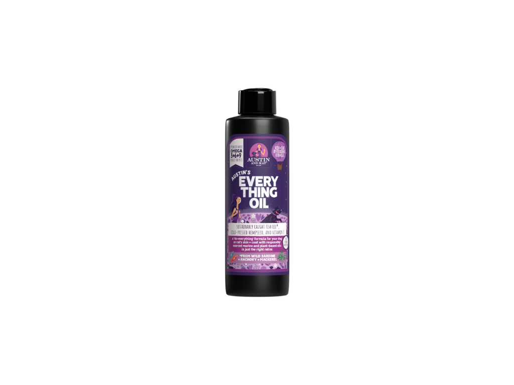 Austin and Kat Austin’s Everything Oil Omega Fish Oil Liquid Skin & Coat Supplement for Dogs is formulated with beneficial fats to support your pup’s overall well-being. Sourced from sustainably caught wild sardine, anchovy, mackerel, and herring, plus organic hemp and flaxseed oil, this full-spectrum omega blend helps keep your furry friend’s skin radiant and coat shiny.